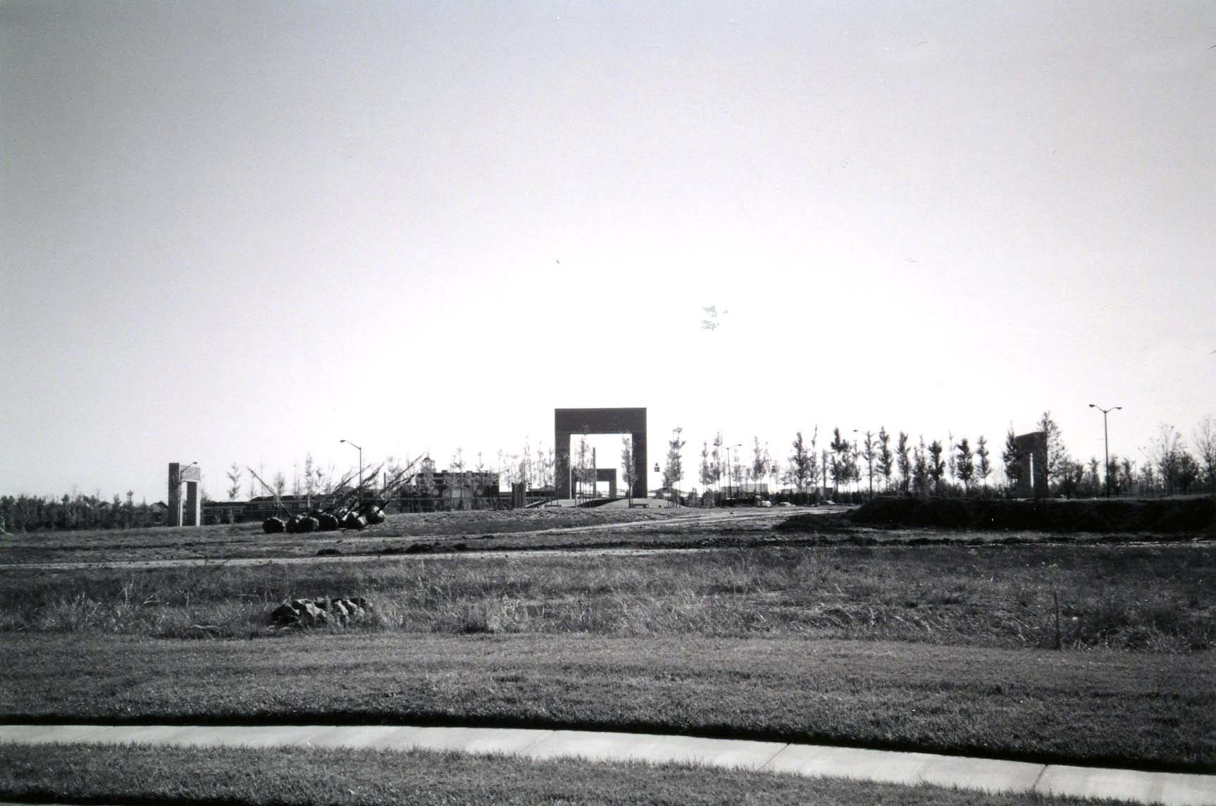 Description: This view shows the four monuments at the corners of Ballantyne Parkway and Johnston Road/ NC 521. Note the trees not yet planted.