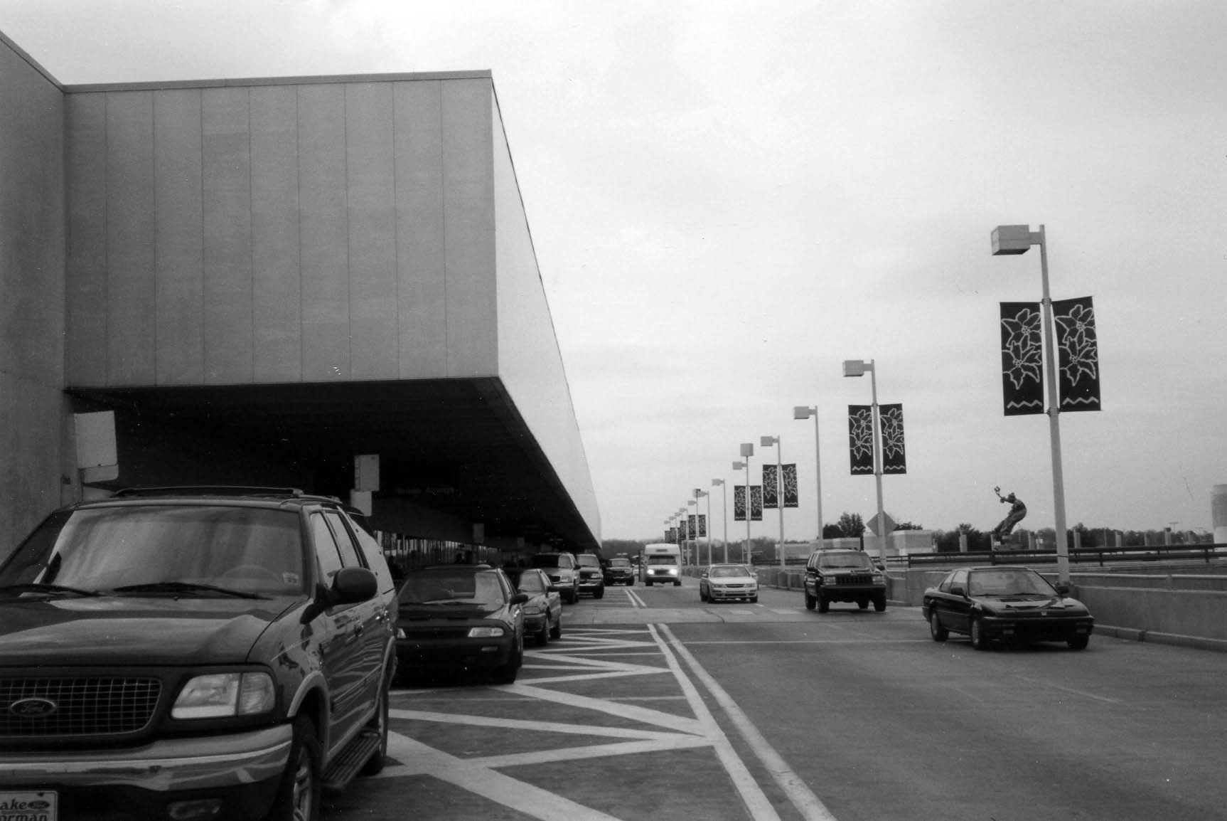 Description: Cars stop to unload at the departure terminal. Note statue of Queen Charlotte background right.