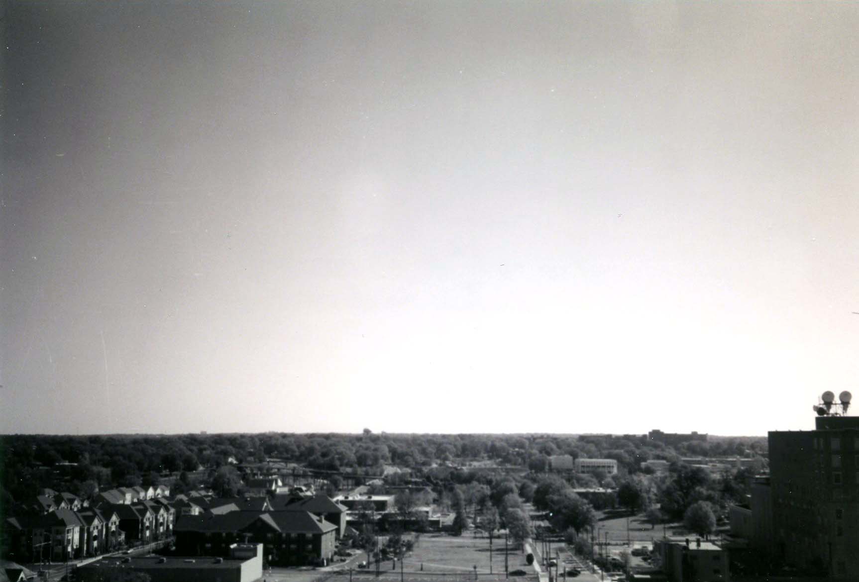 Description: This photograph shows the view from the top of the Seventh Street Station parking deck, looking out East Sixth St. The Earle Village public housing project, built in 1967, is left of center.