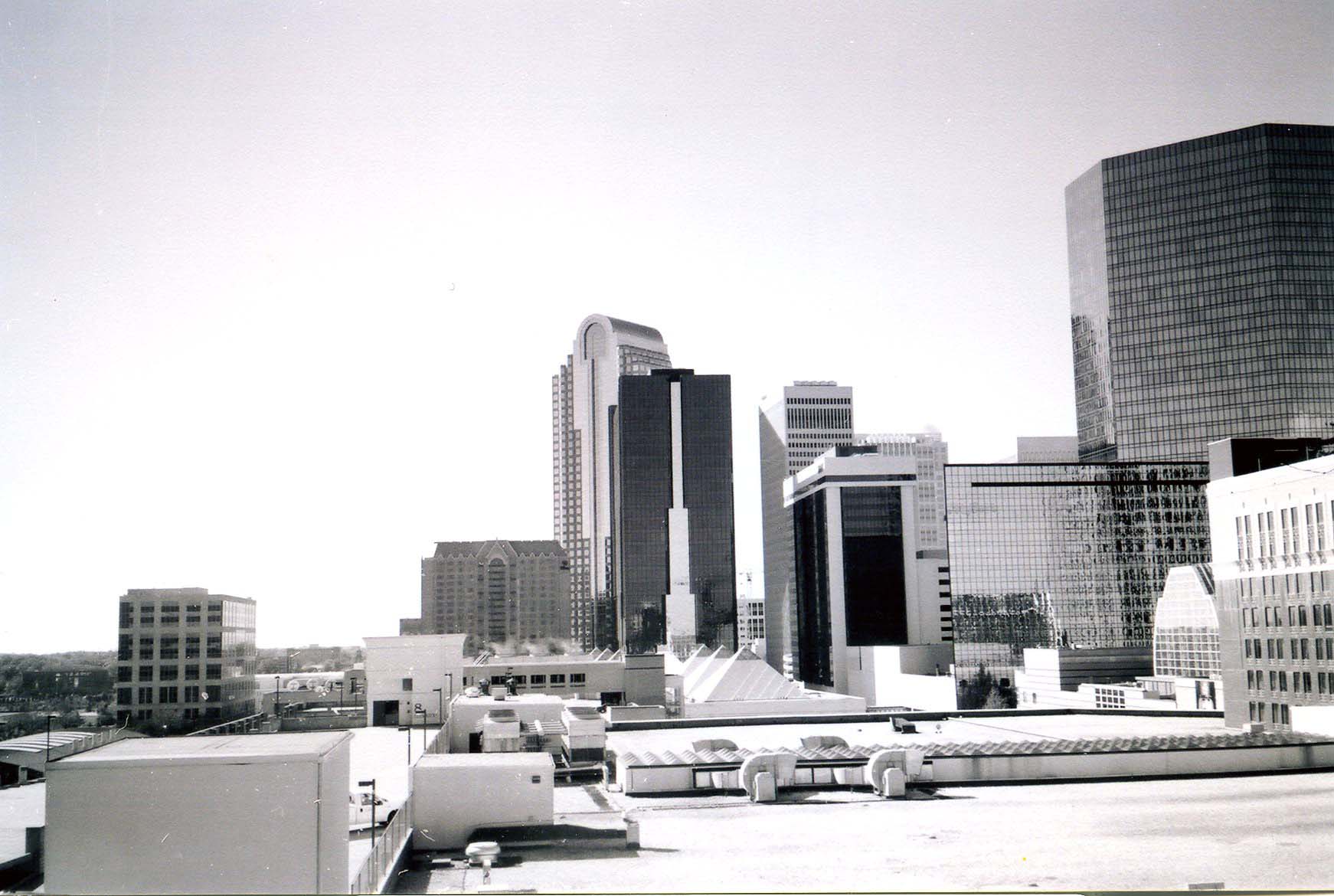 Description: The photo shows the view from the top of the Seventh Street Station parking deck looking south along College Street. In the near foreground the Convention Center and the BB&T Building can be seen. The First Union Building looms up at the southern end of the center city.
