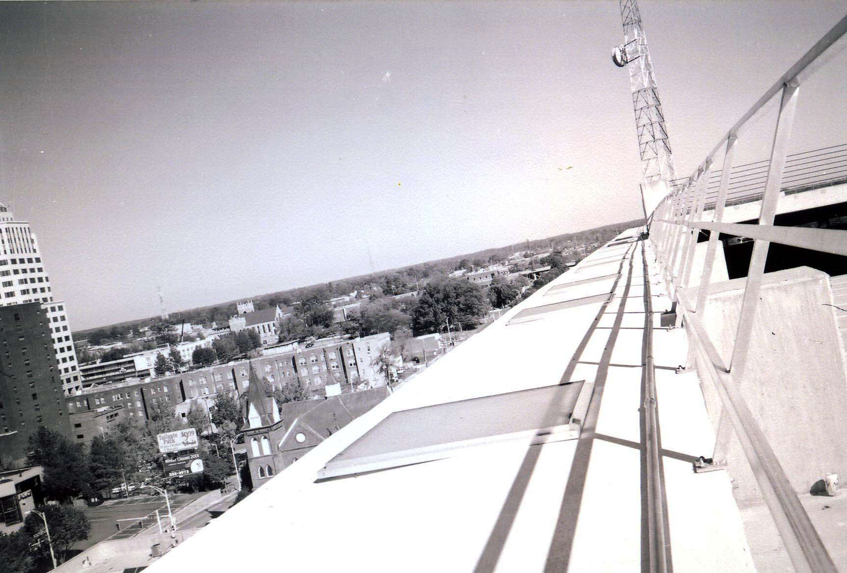 Description: The photo shows the view from the top of the Seventh Street Station parking deck looking north out College Street.