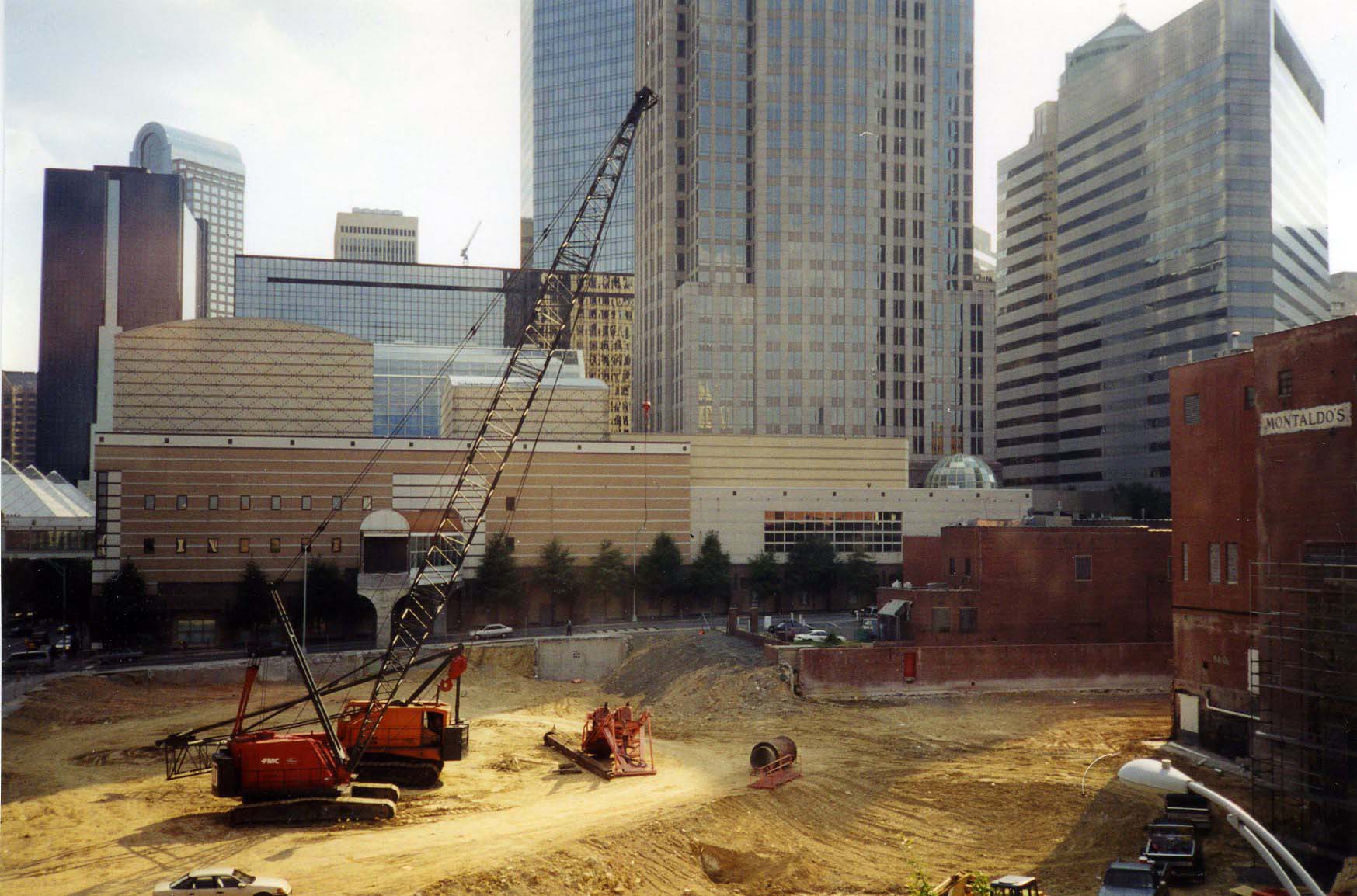 Description: Site of Hearst Tower in first block of E. 6th St, after demolition of CityFair building. The side of the Blumenthal Performing Arts Center on E. 5th St. is visible behind the empty lot.