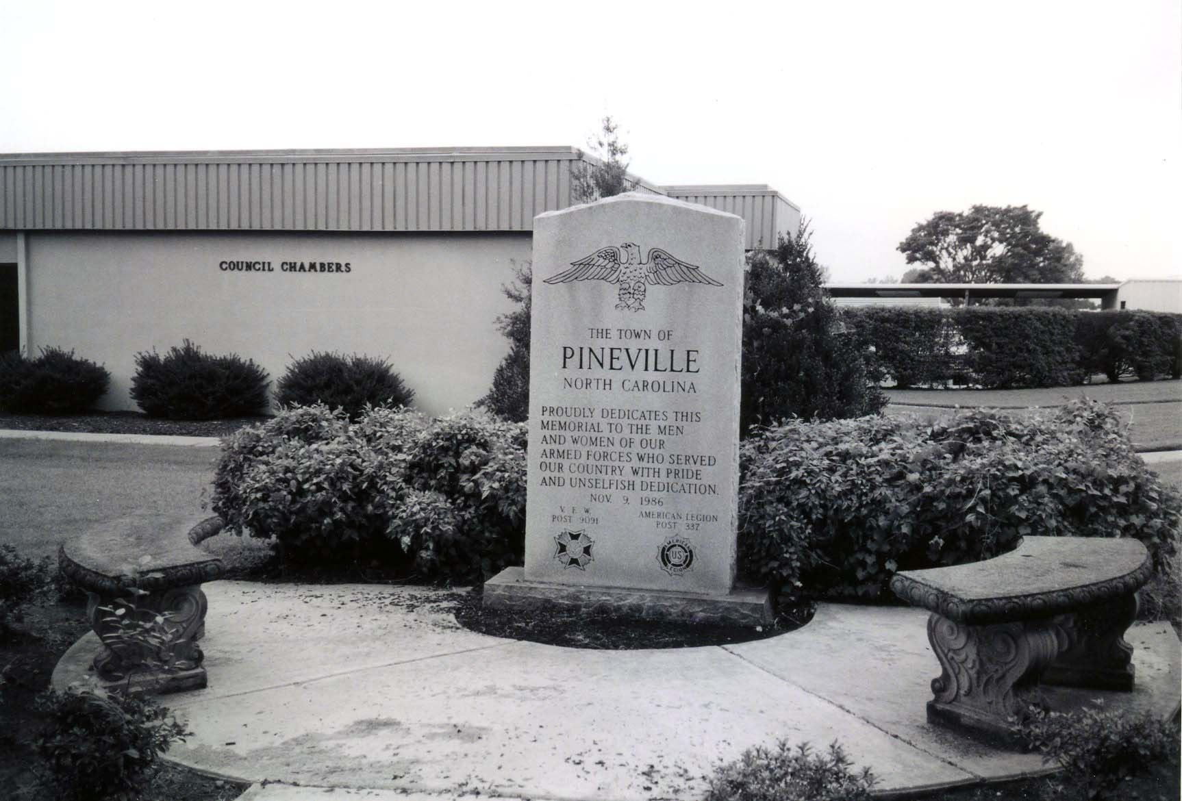 Description: Inscription reads, “The town of Pineville, North Carolina, proudly dedicates this memorial to the men and women of our armed forces who served our country with pride and unselfish dedication.” It is dated November 9, 1986.