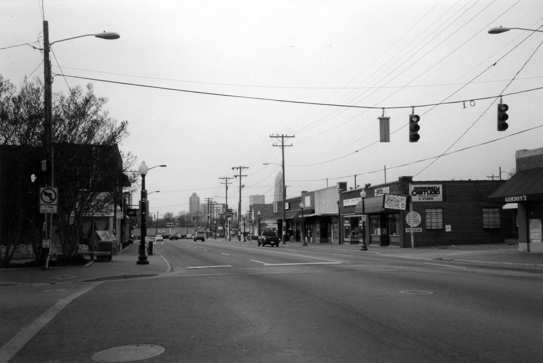 Description: The photograph shows a business district on Central Avenue at Thomas Street, looking west towards uptown.