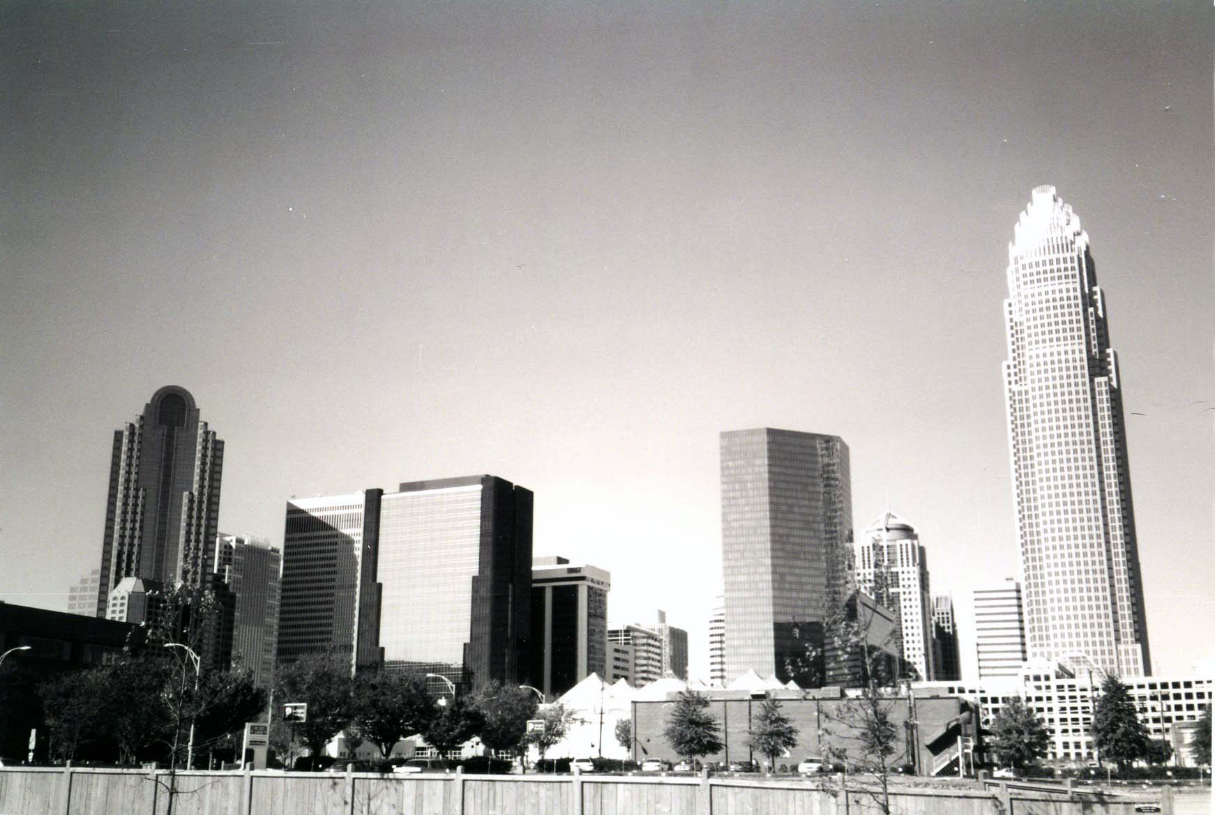 Description: This photograph shows the view from the Police Department parking lot on Davidson Street, looking west. Two bank towers - Bank of America and First Union stand like bookends over the rest of uptown.