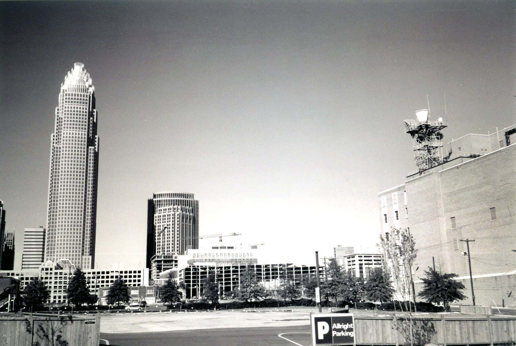Description: This photograph shows the view from the Police Department parking lot on Davidson Street, looking west. The Bank of America Tower is on the left and the Interstate Johnson Lane Building is to the right of it.