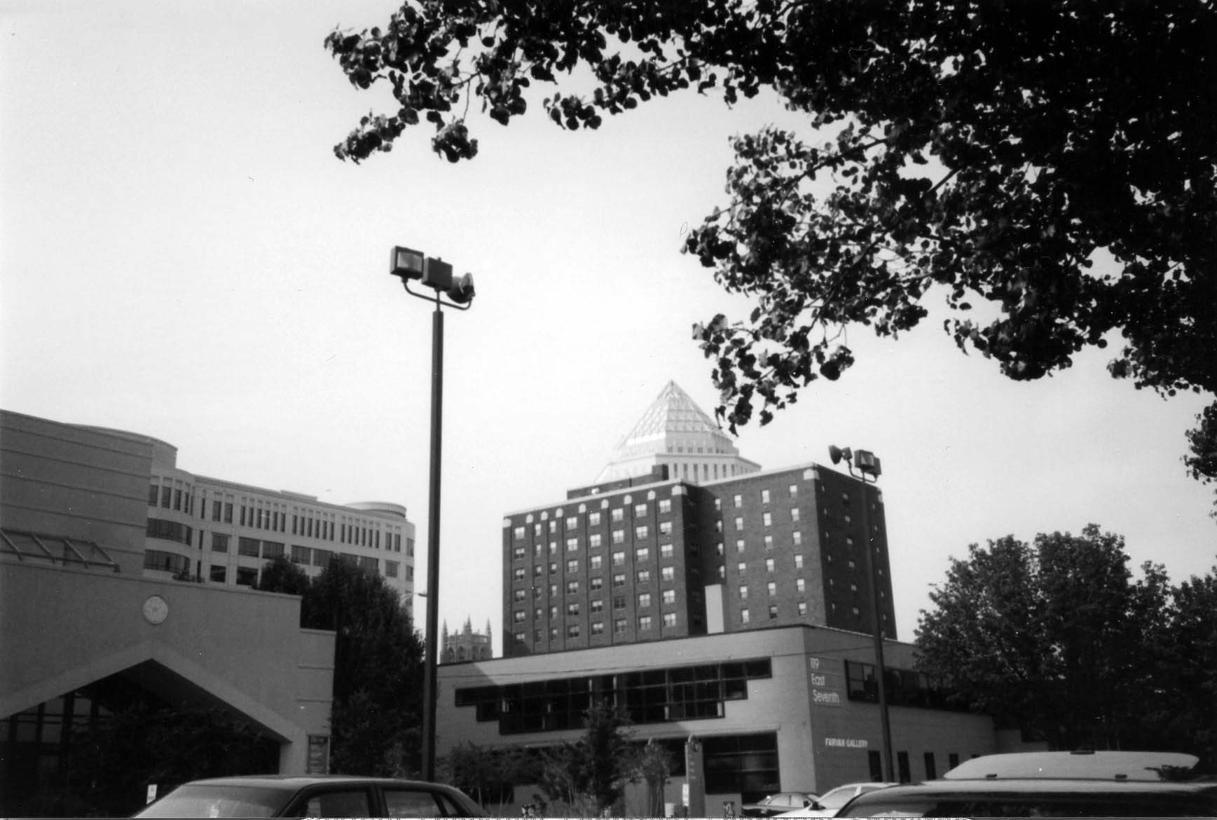 Description: This photograph shows the view from the Spirit Square parking lot, looking northwest.