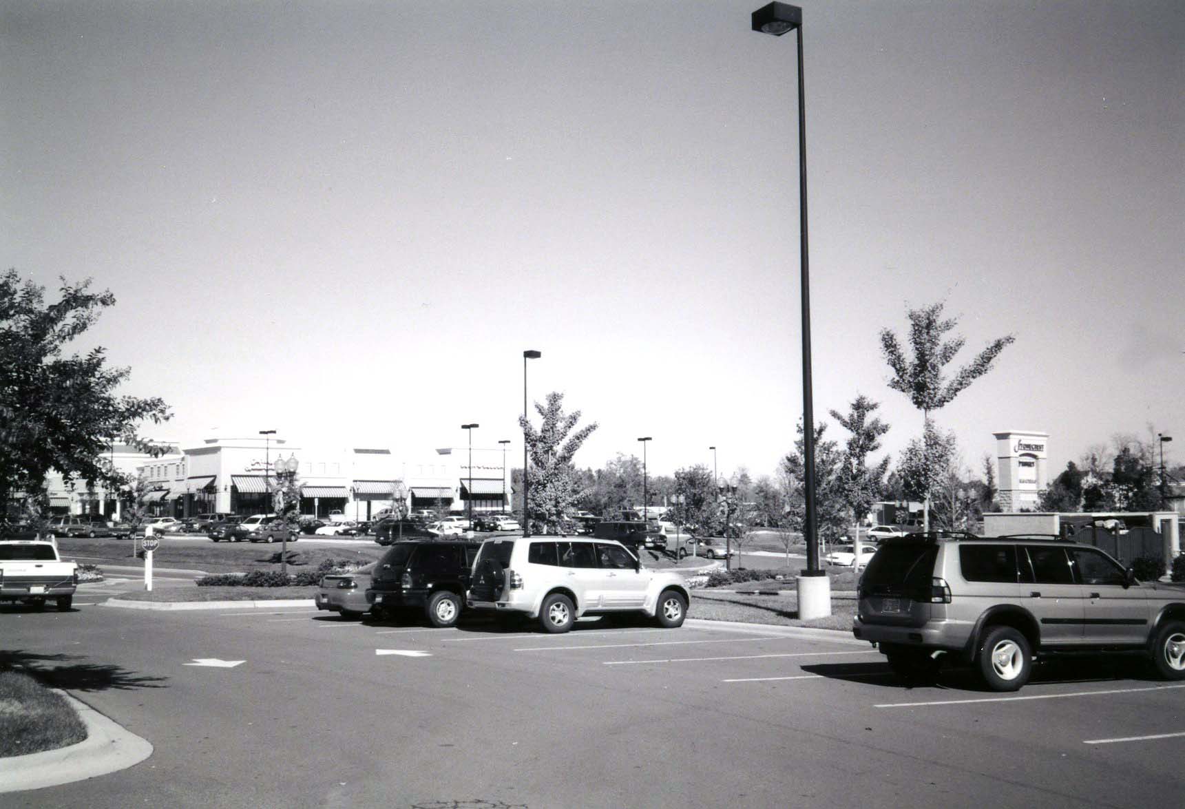 Description: This is the view from within the shopping center, with Rea Road to the right and I-485 beyond the buildings in the center.