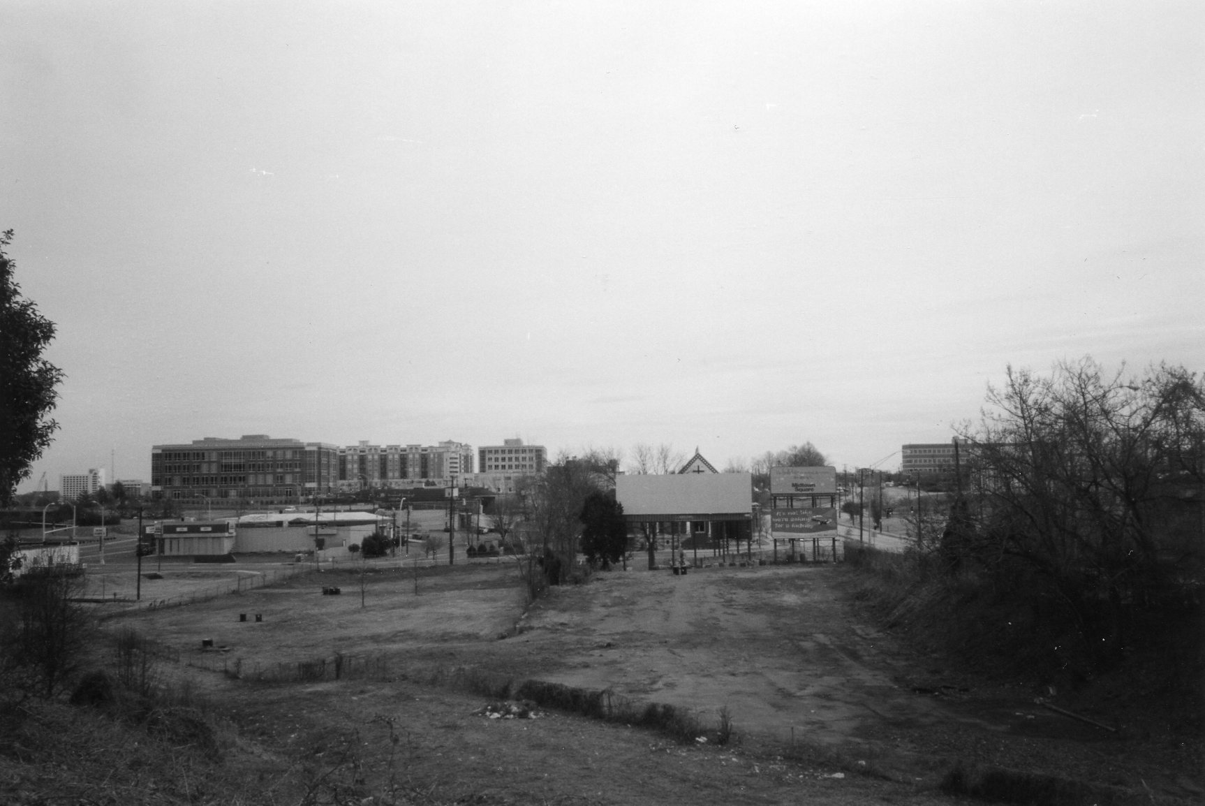Description: This photograph shows West Carson Boulevard on the right-hand side, from the perspective of one looking east. The partially obscured church on the right is the United House of Prayer for All People on South Mint Street. The three buildings foreground left are (going left to right) the American City Building at Church and Morehead Streets, the Camden Apartments on East Morehead, and a multistory fitness studio in Morehead Square.