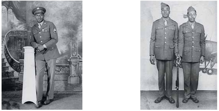 Sumter Denis Moore, a staff sergeant in World War II. THEODORA HENDRY WASHINGTON. Right: Carl F. Neal and friend Fred Hayes were stationed in Dallas when they posed together for this photograph. DOROTHY NEAL CROCKETT.