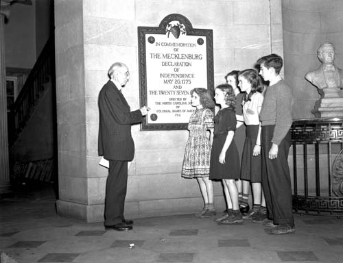 George Snell, a legislative information clerk, talked with children who visited this memorial to the Mecklenburg Declaration of Independence in the Rotunda of the State Capitol in Raleigh in 1939.