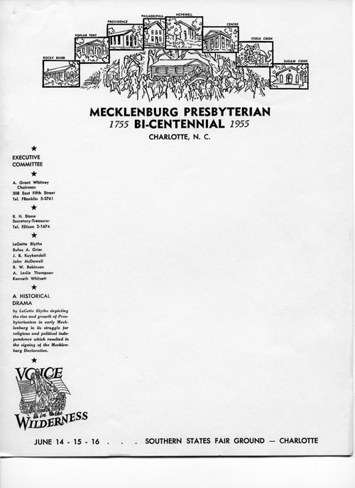 Voice in the Wilderness, by LeGette Blythe, portrays the influence of Presbyterianism in the signing of the Mecklenburg Declaration of Independence.