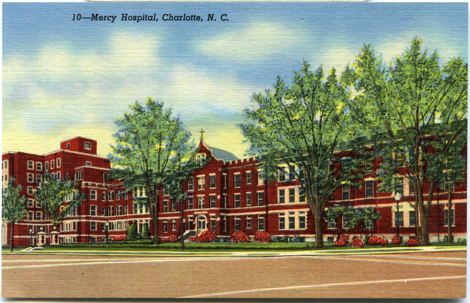 Mercy Hospital was founded by the Sisters of Mercy of Belmont, North Carolina in February 1906. Originally it was a twenty-five bed facility in a wooden building on East First Street behind St. Peter's Roman Catholic Church. The second facility, pictured here, opened in 1916 on East Fifth Street. Additions increasedthe amount of space and by 1960, the hospital had a capacity of 300 beds