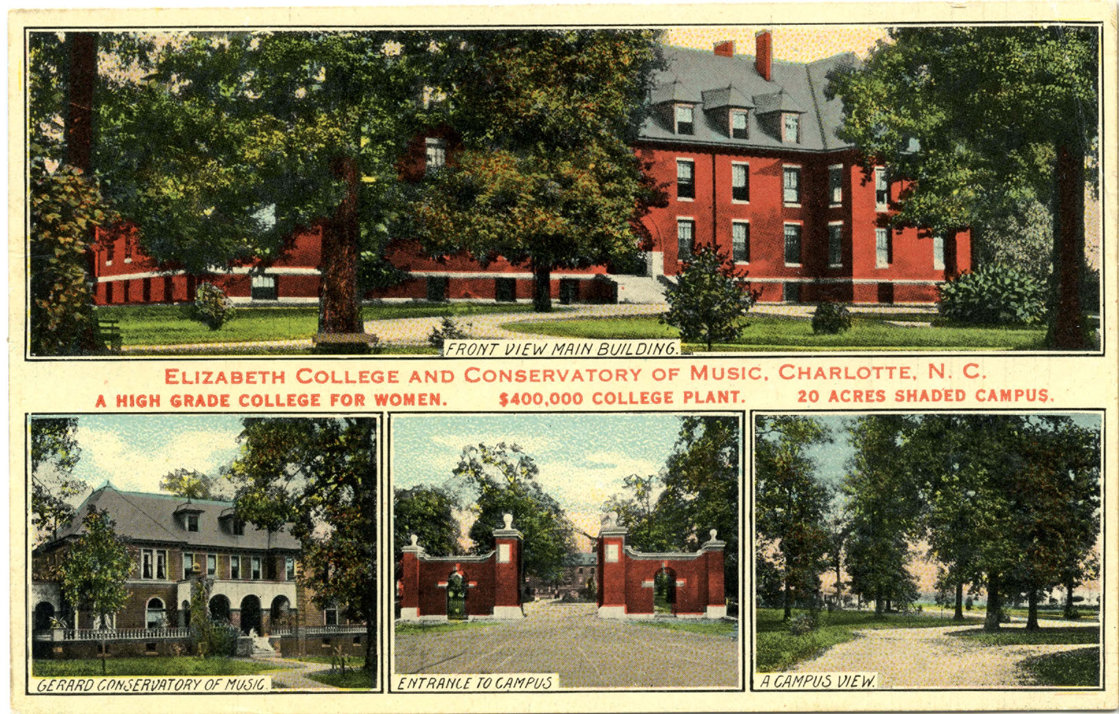 Although there are very fine institutions of learning for young women throughout the state, most of the private schools are not designed to prepare young women for a profession other than teaching or nursing. However, larger cities, like Charlotte, have schools such as Kings Business College and the Fleming University of Shorthand. Both institutions offer training in office skills. In the early 1900s, there are two female colleges in Charlotte, Elizabeth College and Presbyterian College, which is in the next slide. Both schools offer high school classes as well as an advanced college curriculum, but they only admitted white females . Elizabeth College for women was founded in 1896 at what is now the intersection of Elizabeth Avenue and Hawthorne Lane. The main building was 172 by 143 feet, four stories high and constructed of brick and Indiana limestone. At the time this postcard was made in 1900, there were thirty instructors and about 130 students. The school was renowned for the Gerard Conservatory of Music. In 1917, the school merged with Roanoke College for Women in Salem , Virginia. That school burned down in 1921. Presbyterian Hospital bought the Charlotte property in 1917, and the original building became part of the hospital.