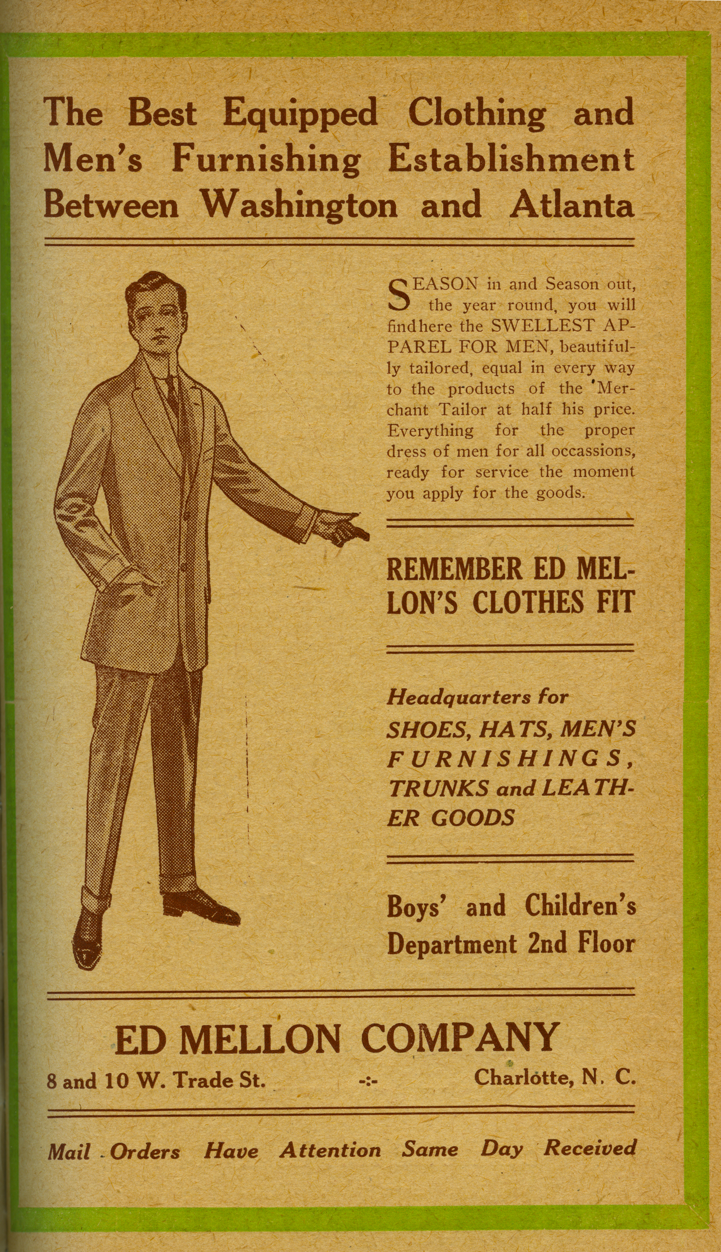 The Ed Mellon Company (see ad below) in Charlotte was a very fashionable store for businessmen. This advertisement dates to 1912 when the store was located at 8-10 West Trade Street.