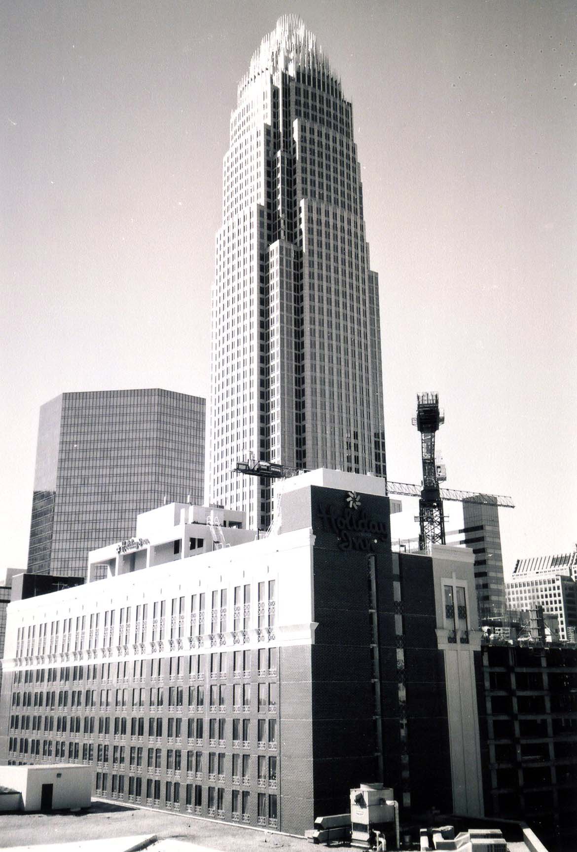 Description: The photo shows the view from the top of the Seventh Street Station parking deck looking southwest. The Holiday Inn is in the foreground and the Bank of America Tower is behind it.