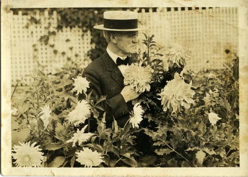 Joseph Benjamin Ivey (1864-1958) photographed in his garden with dahlias