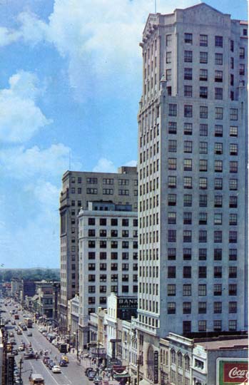 View of uptown Charlotte looking down South Tryon Street in the 1950s. Brownlee Jewelwers is on the left right next door to the Liberty Life Building.