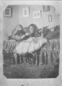 Marie Isabella Matson playing guitar in her dorm room. Guitar, banjo and mandolin clubs were very popular during this time period.
