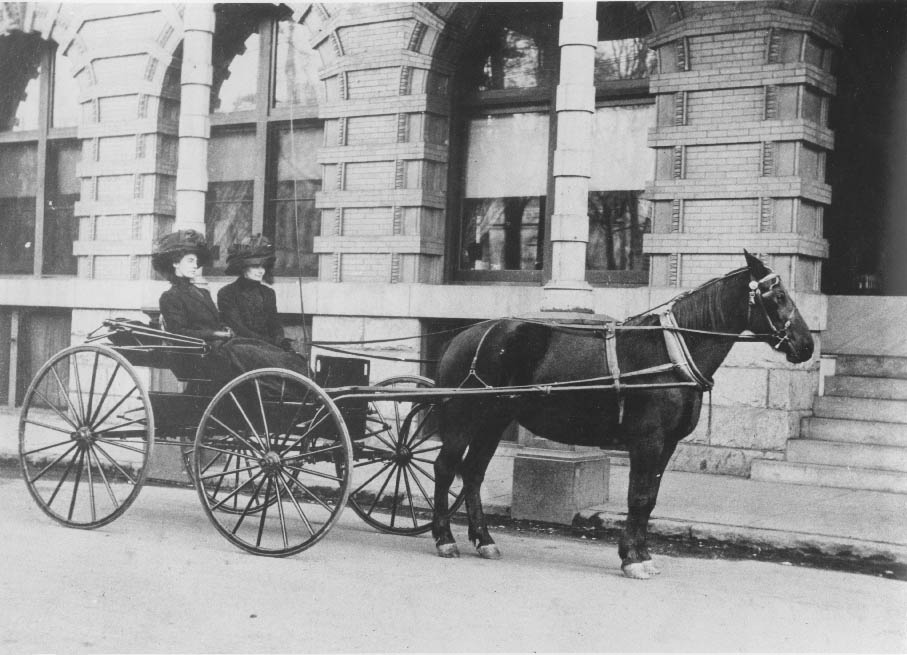 Two women driving a horse and buggy from Thomas B. Hoover's Livery Stable. This picture was taken in front of the Church Street entrance of the Selwyn Hotel. Physical Description: 8x10 glossy Publisher: Unknown