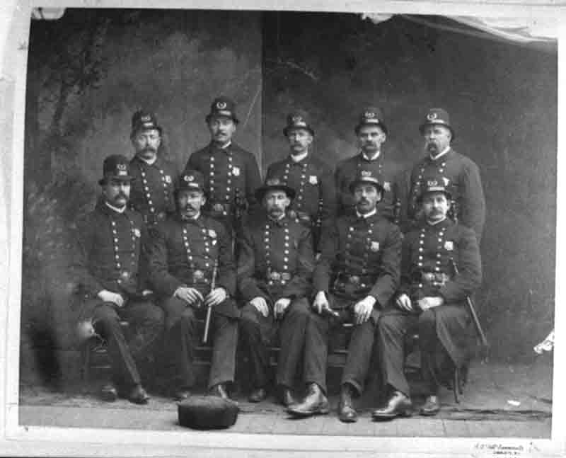The Charlotte Police Department posed for this photograph in 1910. Seated, from left to right: Hugh Shields, Cliff Bell, J.T. Farrington, J.D. Johnson, B.J. Summerow. Standing left to right: M.M. Earnhart, Charles Ayers, Lee Hargett, J.E. Crowell and J.M. Earnhart. Physical Description: 8x10 glossy, 4x5 negatives - 3 copies Publisher: Unknown