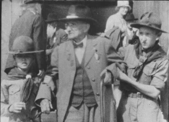 Two Boy Scouts assist one of the attendees of the Confederate Reunion that was held in Charlotte in 1929. This image was donated by the Charlotte Observer on November 18, 1975.