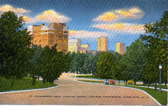 Looking north down Dilworth Road with the Addison Apartments in the distance. Physical Description: 3x5 Publisher: Dixie News Company