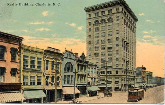 The Realty Building was located at the corner of Trade and Tryon and was built in 1907. It was renamed the Independence Building in 1920 and was torn down in 1970.A trolley can be seen going down the street. Physical Description: 3x5 Publisher: S H Kress