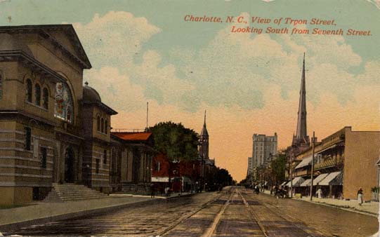 View of Tryon Street looking South from Seventh Street. On the left is the First Baptist Church, the Carengie Library and the City Hall. On the right is the Tryon Street Methodist Church and the Realty Building can be seen in the distance. Physical Description: 3x5 Publisher: Observer Printing House