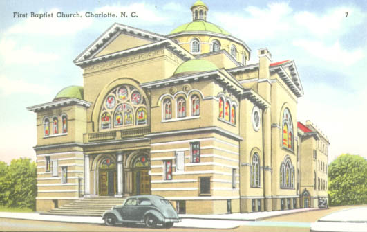 Once the home of First Baptist Church, this site is located in the 300 block of North Tryon Street. The church can trace its history to 1832. This facility was built in 1908 and served the congregation until the 1970s when they moved to a new church. The older facility was transformed into a cultural center for arts education and is known as Spirit Square. Physical Description: 3x5 Publisher: Tichnor Brothers