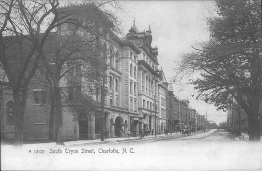 A view of South Tryon Street in the early 1900s. The Academy of Music can be seen on the left. Physical Description: 3x5 black and white Publisher: Rotograph Company
