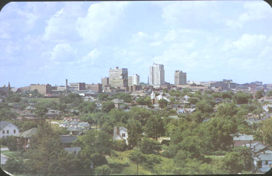 A view of Charlotte's skyline with the twenty-story Liberty Life Building in the background. Foreground is Second Ward, which was renovated during an urban renewal project in the 1970s. Physical Description: 3x5 Publisher: B & H Photo Company