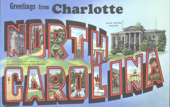 Post card from Charlotte with highlights of North Carolina attractions. Physical Description: 3x5 Publisher: Genuine Curteich