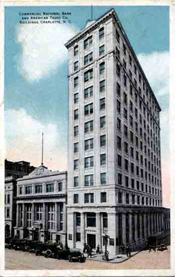 The Commercial National Bank and American Trust Company Building were located in the 200 block of South Tryon Street. On the site of the bank building was the home where Confederate President Jefferson Davis stayed Charlotte from April 18 to the 25th. It was on that site that he learned of President Abraham Lincoln's assassination. Physical Description: 3x5 Publisher: Carolina Card Company