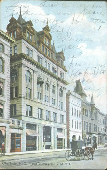 The Trust Building on South Tryon Street housed the Charlotte Opera House (1902-1922) on the first floor. A number of other businesses had offices in the Trust Building, including the Southern Power Company as well as the Academy of Music. Physical Description: 3x5 Publisher: HC Leighton Manufacturers