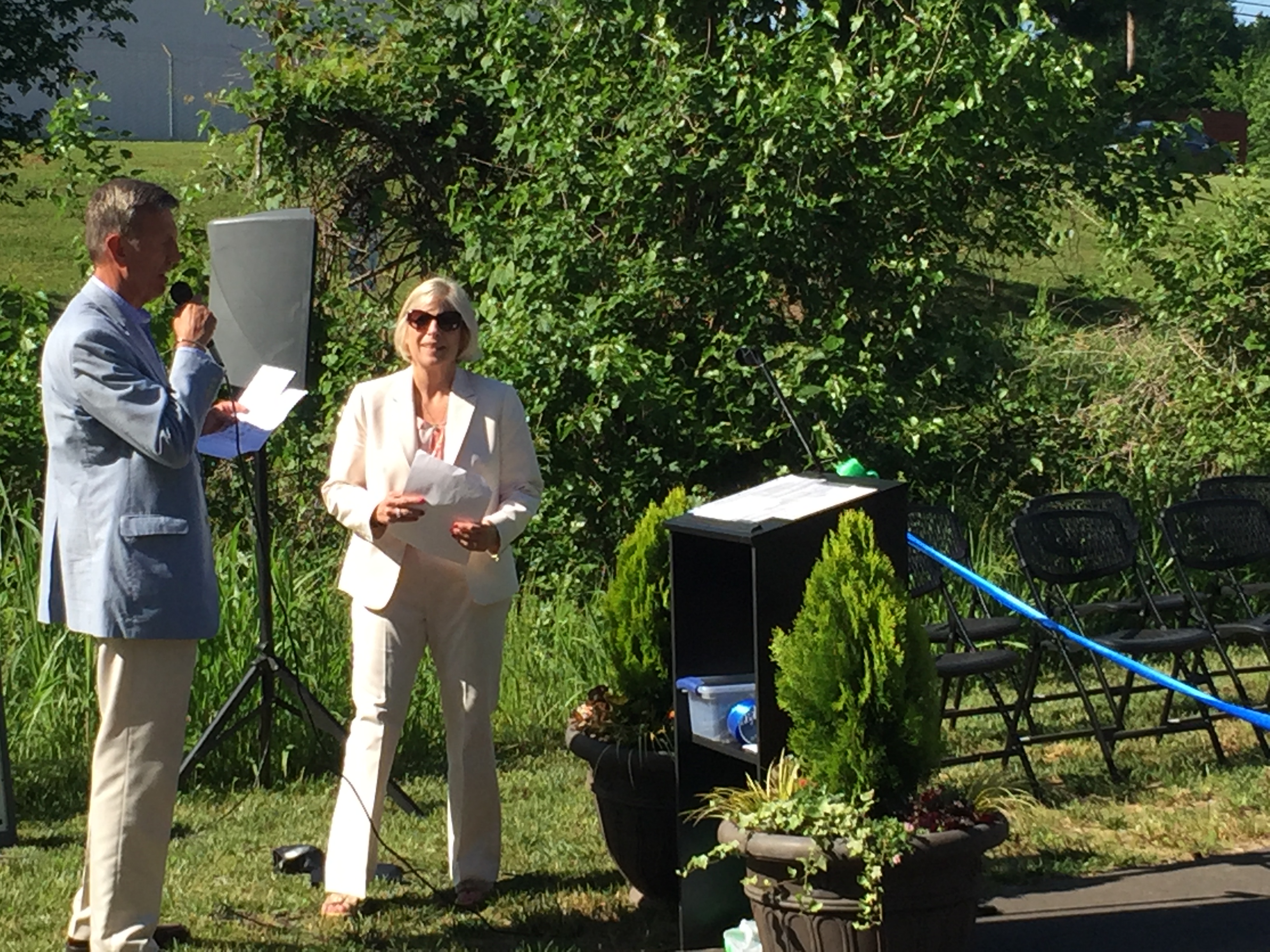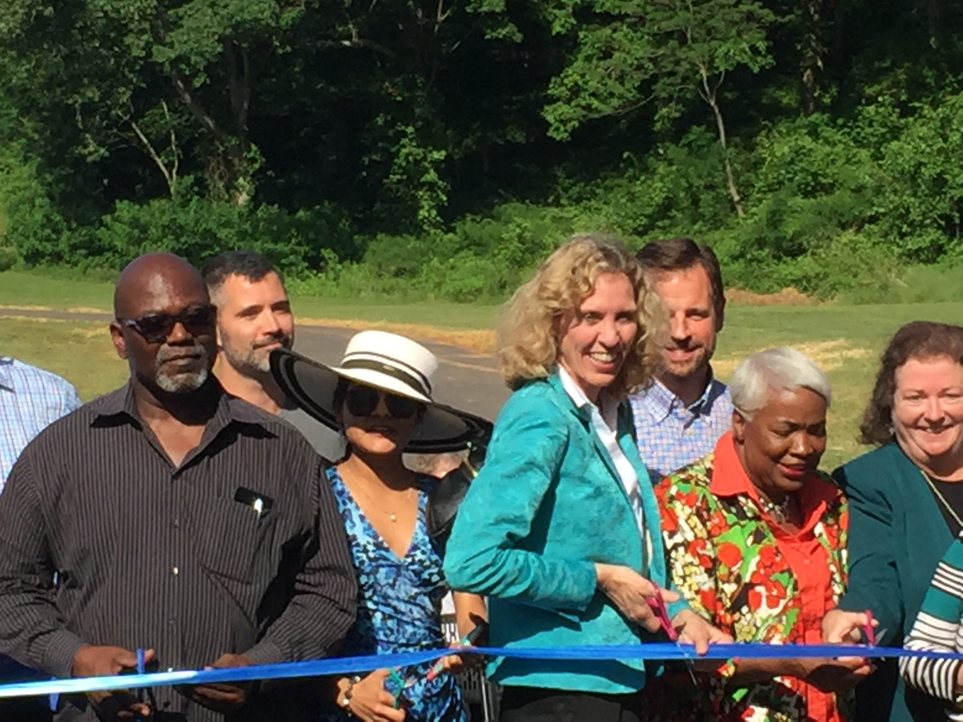 On May 3, 2017, the Greenway reached Cordelia Park. The newly-opened segment from 12th St. to Cordelia Park, following Little Sugar Creek, brought the total mileage of the Greenway system in Mecklenburg County to 37. City and County leaders cooperated to plan and execute the project and appeared together to celebrate its opening. Holding scissors, from left to right are County Commissioner George Dunlap, Mayor Jennifer Roberts, and County Commissioner Vilma Leake.