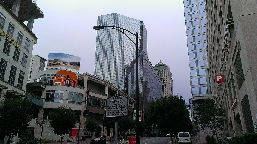 A state historic marker stands amidst new development in the first block of West Trade St. It marks the location of the Mecklenburg Iron Works which was leased to the Confederate Navy during the Civil War by the owner, John Wilkes. After the war, Wilkes regained ownership and operated the factory there until he sold the building to the railroad and moved operations to West Trade Street.